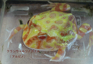 普通の水棲カエルがアルビノになるだけで、不思議な印象に・・・ 飼育下では、非常に悪食で飼育は、容易です。 約1ヶ月、とリートメント済。 原産国;アメリカ 2008年9月13日入荷 平均寿命;10年以上 成体時の大きさ:7〜10cm 現在の大きさ:約5〜6cm |