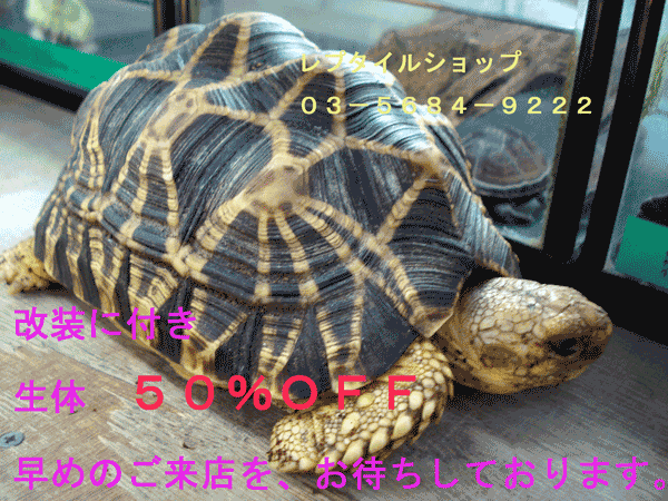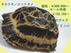 インドホシガメ 現在のサイズ:5〜6cm 価格:¥19,000− セール価格:¥9,500− |